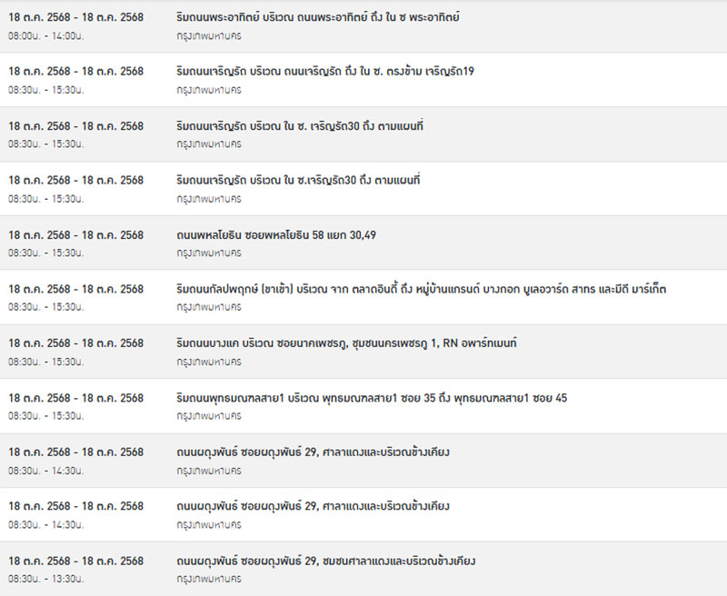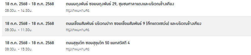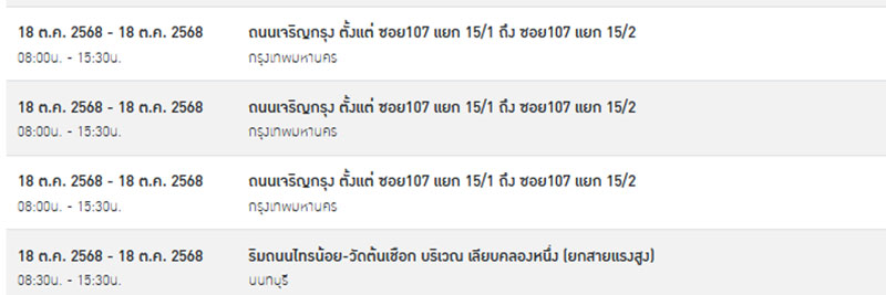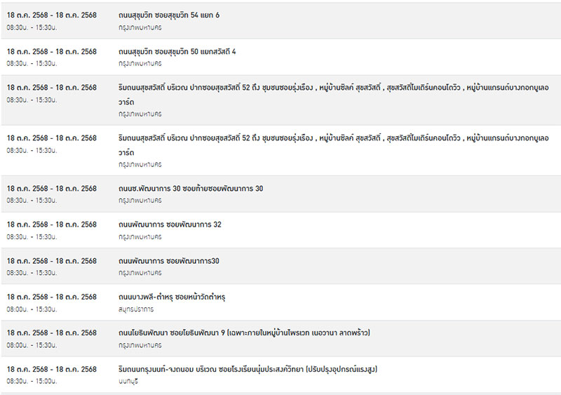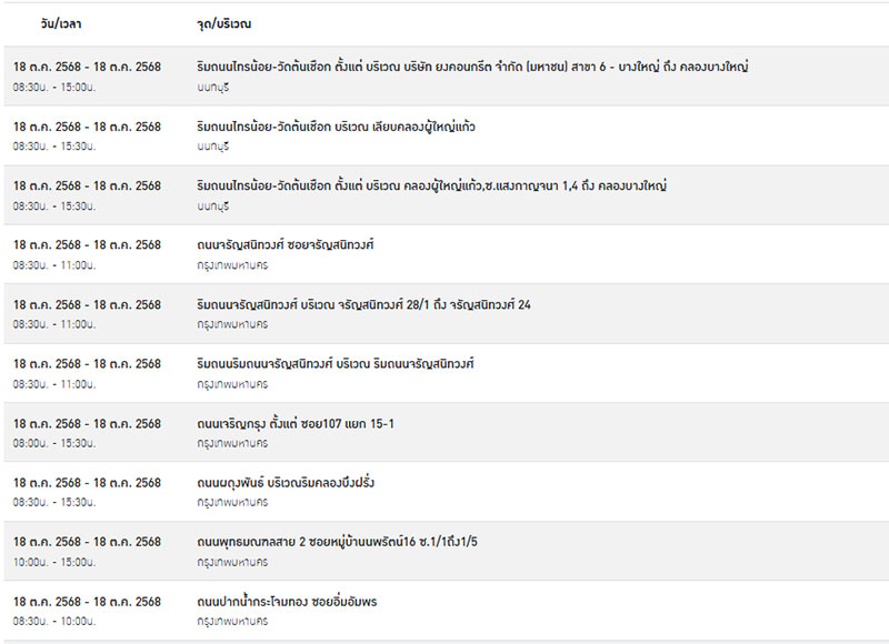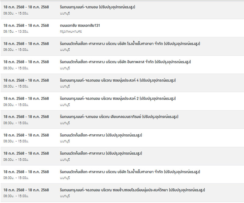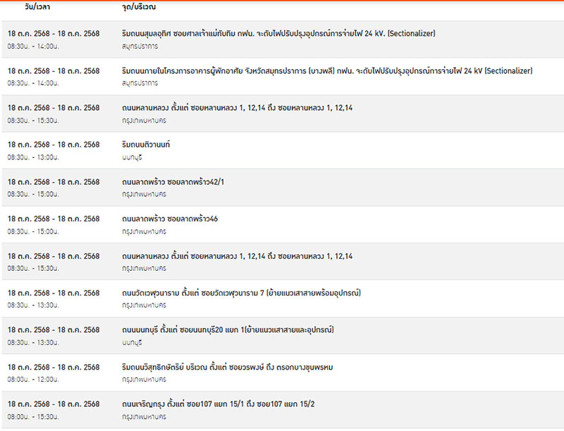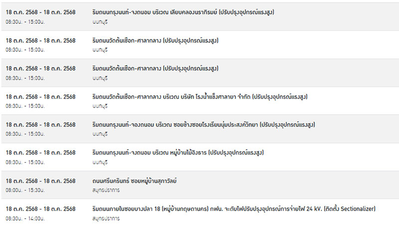 วันที่ 17 ตุลาคม 2568 การไฟฟ้านครหลวง (กฟน.) แจ้งประกาศการ “ดับไฟ” ชั่วคราว ในบางพื้นที่ของกรุงเทพมหานคร สมุทรปราการ นนทบุรี ในวันเสาร์ที่ 18 ตุลาคม 2568 เพื่อพัฒนาหรือบำรุงรักษาระบบการจ่ายกระแสไฟฟ้าให้มีประสิทธิภาพยิ่งขึ้นใน 63 จุด ดังต่อไปนี้