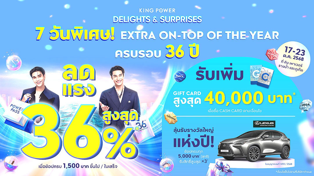 จัดแคมเปญ “KING POWER DELIGHTS & SURPRISES MORE POWER MORE POSSIBILITIES WITH POWER PASS 7 วันพิเศษ! เดือนเกิด คิง เพาเวอร์ คุ้มจนต้องช้อป EXTRA ON-TOP OF THE YEAR ครบรอบ 36 ปี ลดสูงสุด 36%” ตั้งแต่วันที่ 17-23 ตุลาคม 2568 ที่ คิง เพาเวอร์ รางน้ำ และภูเก็ต ช้อปคุ้ม OF THE YEAR : ลดสูงสุด 36% เมื่อช้อปครบ 1,500 บาทขึ้นไป/ใบเสร็จ ซื้อ CASH CARD สุดคุ้มก่อนช้อป รับฟรี GIFT CARD มูลค่าสูงสุด 40,000 บาท (เฉพาะแผนกแฟชั่น นาฬิกา และเครื่องประดับ) สมาชิก POWER PASS ช้อปครบทุก 5,000 บาท รับสิทธิ์ลุ้นรถยนต์ LEXUS รุ่น NX 350h Luxury ,แลกคุ้ม OF THE YEAR : สมาชิก POWER PASS ใช้ CARAT แลกรับของพรีเมียมและส่วนลดจากแบรนด์ดังกว่า 200 รายการ ,เซอร์ไพรส์ OF THE YEAR : เพียงมียอดช้อปหรือแลก CARAT ตามกำหนด รับ 1 สิทธิ์ ร่วมกิจกรรมลุ้นรับของรางวัล ที่คิง เพาเวอร์ รางน้ำ