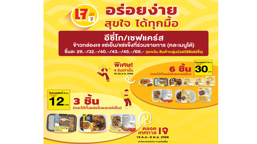 ขอเชิญชวนลูกค้า ต้อนรับเทศกาลเจปี 2568 ซึ่งจัดขึ้นในช่วง วันที่ 19-29 ตุลาคม 2568 นี้ ไปพร้อมกับเซเว่น อีเลฟเว่น ที่จัดเต็มเมนูเจหลากหลายสไตล์ ไม่ว่าจะเมนูคาว หวาน หรือของว่าง ก็อร่อยง่าย สุขใจ และสะดวกสุด ๆ พร้อมโปรโมชั่นสุดคุ้มให้ Joy ได้ทุกวัน ที่ร้านเซเว่น อีเลฟเว่น และ 7Delivery ทุกสาขาทั่วประเทศ ตลอด 24 ชั่วโมง