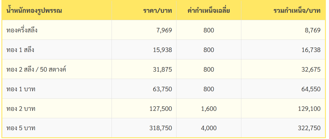 ขณะที่ ราคาทองรูปพรรณ น้ำหนักทองครึ่งสลึง อยู่ที่ 7,969 บาท ทอง 1 สลึงอยู่ที่ 15,938 บาท ทอง 2 สลึง หรือ 50 สตางค์ อยู่ที่ 31,875 บาท ทั้งนี้ เป็นราคาทองที่ยังไม่รวมค่ากำเหน็จ ภาษีและค่าเสื่อมที่ร้านทองจะหักออก