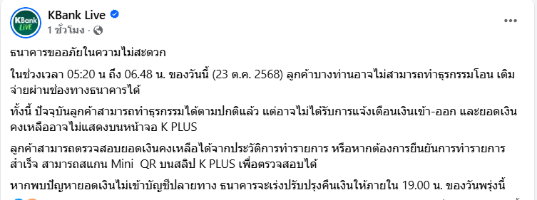 23 ตุลาคม 2568 เพจเฟซบุ๊ก KBank Live ของ ธนาคารกสิกร โพสต์เฟซบุ๊ก ระบุว่า ธนาคารขออภัยในความไม่สะดวก
