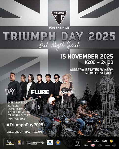 นายชินศักดิ์ กิตติอมรกุล ผู้จัดการฝ่ายปฏิบัติการเชิงพาณิชย์ บริษัท ไทรอัมพ์ มอเตอร์ไซเคิลส์ (ไทยแลนด์) จำกัด กล่าวว่า ไทรอัมพ์ได้เตรียมจัดงาน Triumph Day 2025 : Brit Night Spirit บิ๊กอีเวนต์แห่งปีที่เหล่าสุภาพบุรุษและสุภาพสตรีผู้หลงใหลในสไตล์อังกฤษ และความคลาสสิกของไทรอัมพ์รอคอย โดยผู้ร่วมงานจะสัมผัสประสบการณ์สุดพิเศษผ่านกิจกรรมมากมาย ทั้งการพบปะแลกเปลี่ยนประสบการณ์กับผู้ขับขี่ไทรอัมพ์จากทั่วประเทศ ดื่มด่ำไปกับความบันเทิงและเสียงดนตรีจาก Dax Rock Rider, Flure และ DJ Foamie ช้อปปิ้งสินค้าจากไทรอัมพ์และแบรนด์พันธมิตร ทั้งยังสนุกสนานไปกับเกมและจุดถ่ายภาพพร้อมรับของที่ระลึกให้เก็บเป็นความทรงจำ พร้อมเพลิดเพลินไปกับนิทรรศการรถจักรยานยนต์ไทรอัมพ์หลากหลายรุ่น ตลอดจนอร่อยไปกับอาหารและเครื่องดื่มจากร้านที่คัดสรรมาให้แบบเต็มอิ่มตั้งแต่ช่วงเย็นถึงเที่ยงคืนท่ามกลางบรรยากาศอันงดงามของไร่องุ่น