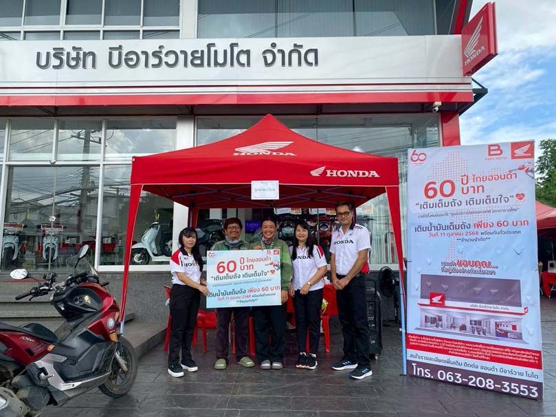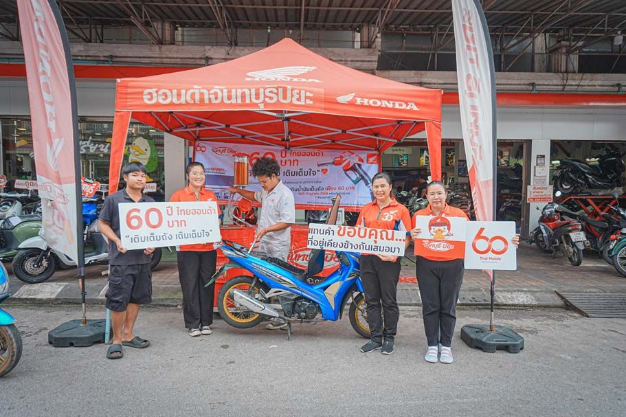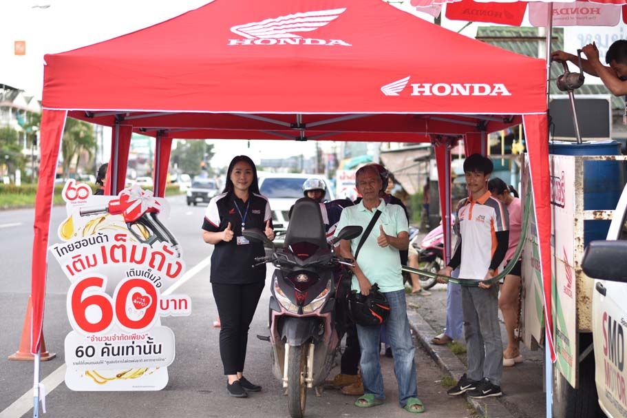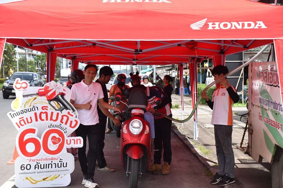 ไทยฮอนด้า ผู้ผลิตและจัดจำหน่ายรถจักรยานยนต์และเครื่องยนต์อเนกประสงค์ฮอนด้าในประเทศไทย ร่วมกับร้านผู้จำหน่ายทั่วประเทศ จัดกิจกรรมพิเศษ “เติมเต็มถัง เติมเต็มใจ” เติมน้ำมันเต็มถังในราคาเพียง 60 บาท เพื่อเป็นการขอบคุณลูกค้าชาวไทย ที่มอบความไว้วางใจในแบรนด์มาอย่างยาวนานกว่า 6 ทศวรรษ เนื่องในโอกาสครบรอบ 60 ปี ภายใต้แนวคิด “60 ปีไทยฮอนด้า เคียงข้างกันตลอดไป” เพื่อส่งต่อพลังแห่งความไว้วางใจจากผู้ใช้รถสู่สังคมไทย