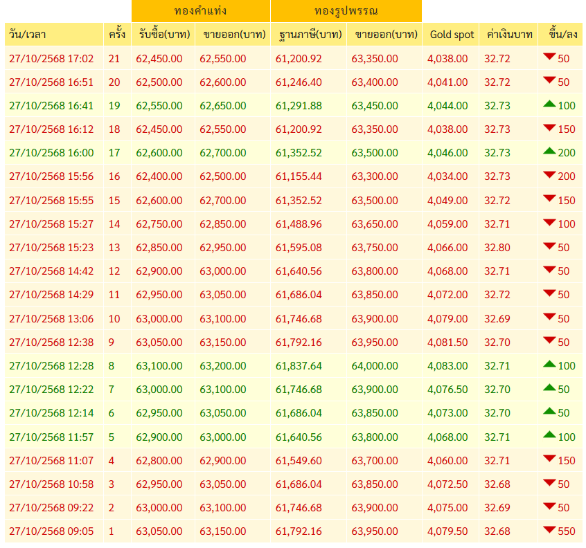 27 ตุลาคม 2568 สมาคมค้าทองคำ ประกาศราคาล่าสุด 17.02 น. ทองคำแท่ง รับซื้อ 62,450.00 ขายออก 62,550.00 ทองรูปพรรณ รับซื้อ 61,200.92 ขายออก 63,350.00 โดยตั้งแต่เวลา 09.05 น. ถึงเวลา 17.02 น. มีการปรับขึ้น-ลงราคาทอง 21 ครั้ง