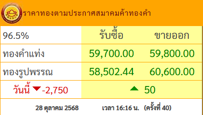 ทองคำแท่งในประเทศ ราคารับซื้ออยู่ที่บาทละ 59,700.00 บาท ขายออกที่ราคาบาทละ 59,800.00 บาท ตามประกาศครั้งที่ 40 ส่วนราคาทองรูปพรรณ รับซื้ออยู่ที่บาทละ 58,502.44 บาท และขายออกที่ราคา 60,600.00 บาท