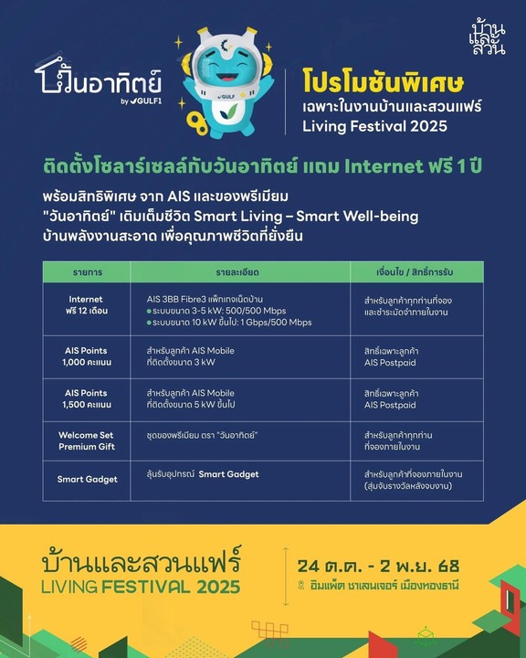 เชิญผู้สนใจแวะมาที่บูธ “วันอาทิตย์” by GULF1 ในงานบ้านและสวนแฟร์ฯ ได้ตั้งแต่วันนี้ – 2 พฤศจิกายน 2568 ณ อิมแพ็ค ชาเลนเจอร์ เมืองทองธานี ทีมงานผู้เชี่ยวชาญพร้อมให้คำปรึกษา ช่วยคำนวณขนาดการติดตั้ง หรือออกแบบ 3D เบื้องต้นฟรี เพื่อประเมินความคุ้มค่าและเลือกโซลูชันที่เหมาะสมกับการใช้งาน พร้อมชม “บ้านตัวอย่าง” (Theme House) ที่ผสานเทคโนโลยีระบบโซลาร์เซลล์และอินเทอร์เน็ตความเร็วสูง ตอบโจทย์ทุกไลฟ์สไตล์ได้อย่างลงตัว ภายใต้แนวคิด Smart Energy, Smart Living, Smart Well-being