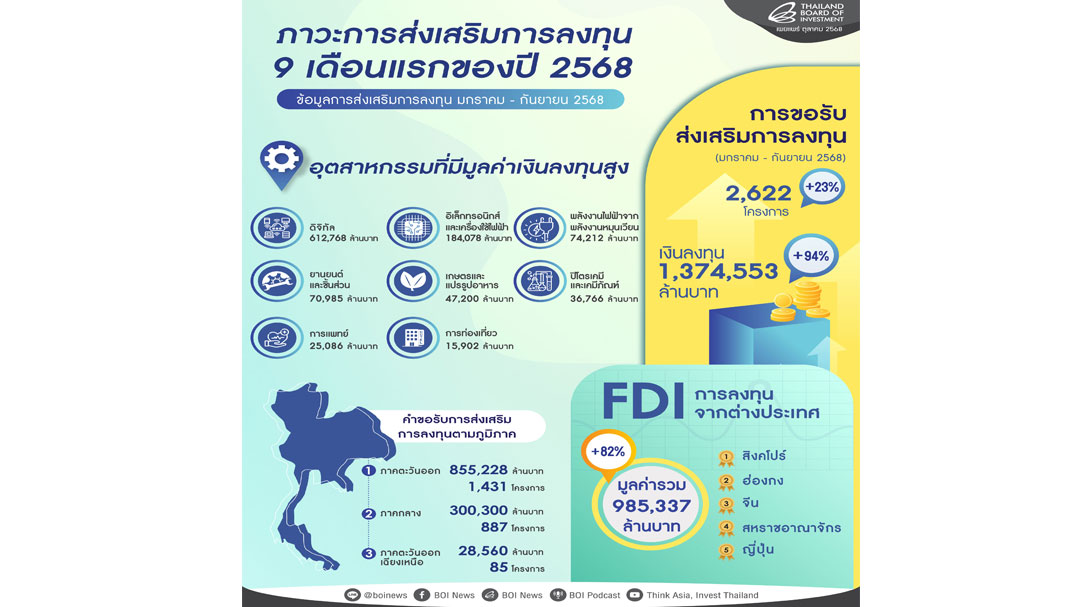 สำหรับสถิติในขั้นการอนุมัติส่งเสริมการลงทุน ในช่วง 9 เดือนแรก ปี 2568 มีจำนวน 2,413 โครงการ มูลค่าเงินลงทุน 1,114,798 ล้านบาท โดยประโยชน์ของโครงการที่ได้รับอนุมัติเหล่านี้ คาดว่าจะมีการใช้วัตถุดิบในประเทศประมาณ 6.1 แสนล้านบาท/ปี เกิดการจ้างงานคนไทยกว่า 175,000 ตำแหน่ง และทำให้มูลค่าส่งออกของประเทศเพิ่มขึ้นกว่า 1.4 ล้านล้านบาท/ปี ขณะที่ตัวเลขในขั้นการออกบัตรส่งเสริม มีจำนวน 2,050 โครงการ เงินลงทุนรวม 947,661 ล้านบาท