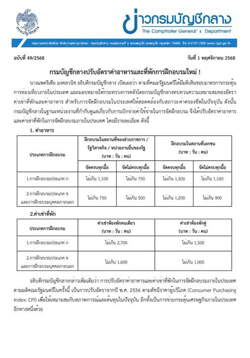 2 พฤศจิกายน 2568 นางแพตริเซีย มงคลวนิช อธิบดีกรมบัญชีกลาง เปิดเผยว่า ตามที่คณะรัฐมนตรีได้มีมติเห็นชอบมาตรการกระตุ้นการท่องเที่ยวภายในประเทศ และมอบหมายให้กระทรวงการคลังโดยกรมบัญชีกลางทบทวนความเหมาะสมของอัตราค่าเช่าที่พักและค่าอาหาร สำหรับการจัดฝึกอบรมในประเทศให้สอดคล้องกับสภาวะค่าครองชีพในปัจจุบัน ดังนั้น กรมบัญชีกลางในฐานะหน่วยงานที่กำกับดูแลเกี่ยวกับการเบิกจ่ายค่าใช้จ่ายในการจัดฝึกอบรม จึงได้ปรับอัตราค่าอาหารและค่าเช่าที่พักในการจัดฝึกอบรมภายในประเทศ โ