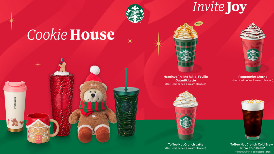 สตาร์บัคส์ ประเทศไทย เสิร์ฟความอร่อยช่วงเทศกาลคริสต์มาสที่กำลังจะมาถึงด้วยเมนูเครื่องดื่มและของว่างสุดพิเศษ ตั้งแต่วันที่ 4 พฤศจิกายน 2568 ถึง 5 มกราคม 2569 ที่ร้านสตาร์บัคส์ทุกสาขาทั่วประเทศ