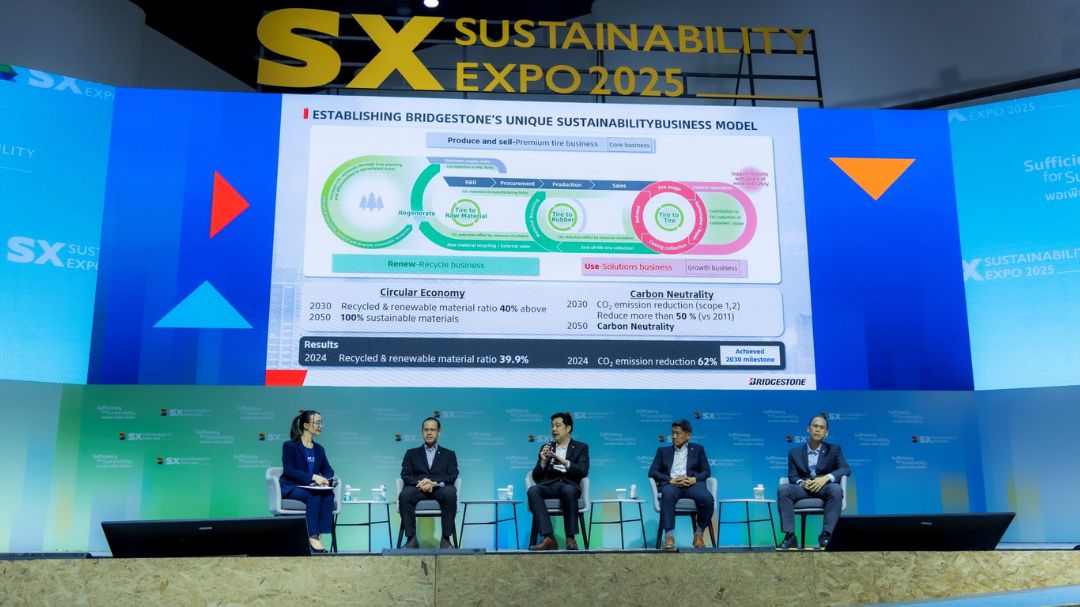 นายอรรถพล แพรพริ้วงาม ผู้อำนวยการสายงานวิศวกรรมยางล้อและกำกับดูแลความยั่งยืน บริษัท ไทยบริดจสโตน จำกัด พร้อมทีมงาน ร่วมเสวนาในงาน Sustainability Expo 2025 (SX2025) หัวข้อ “การขับเคลื่อนสู่ความยั่งยืน: นวัตกรรมยางรถยนต์และเศรษฐกิจหมุนเวียน” ตอกย้ำความมุ่งมั่นของบริดจสโตนในการพัฒนายางหล่อดอกเทคโนโลยีล้ำสมัย ที่มีประสิทธิภาพเทียบเท่ายางใหม่ ช่วยลดต้นทุนและเป็นมิตรต่อสิ่งแวดล้อม ความร่วมมือกับไทยเบฟเวอเรจสะท้อนการเดินหน้าสู่วิสัยทัศน์ด้านสิ่งแวดล้อมของบริดจสโตน เพื่อบรรลุความเป็นกลางทางคาร์บอนและการผลิตยางจากวัสดุยั่งยืน 100% ภายในปี 2593 สอดรับกับนโยบายสร้างการเติบโตอย่างมั่นคงและยั่งยืนทางธุรกิจของบริดจสโตนไปพร้อมกับลูกค้าและสังคมไทย