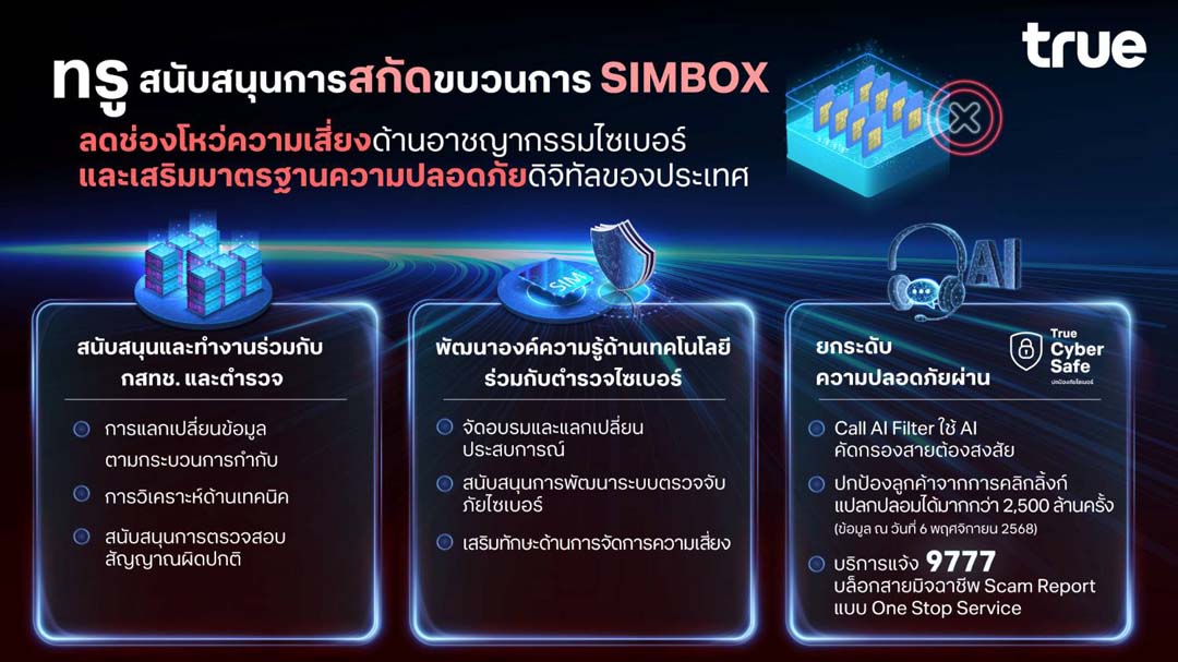 ทรู คอร์ปอเรชั่น เดินหน้าร่วมมือกับหน่วยงานภาครัฐในการป้องกันภัยไซเบอร์และโทรหลอกลวง. ซึ่งสร้างความเดือดร้อนให้ประชาชนและส่งผลกระทบต่อความเชื่อมั่นในโลกดิจิทัลของประเทศ โดยล่าสุด สำนักงาน กสทช. และเจ้าหน้าที่ตำรวจ สามารถบุกเข้ายึดเครื่อง SIMBOX อุปกรณ์สำคัญที่ใช้ในการโทรหลอกลวง ได้ในพื้นที่จังหวัดสระแก้วและนนทบุรี ซึ่งปฏิบัติการนี้เป็นผลจากการแลกเปลี่ยนข้อมูลตามขั้นตอนทางกฎหมาย และการวิเคราะห์ทางเทคนิคร่วมกันระหว่างทรูและหน่วยงานที่เกี่ยวข้อง รวมถึงสนับสนุนการตรวจสอบสัญญาณผิดปกติ ซึ่งการทำงานอย่างใกล้ชิดนี้ช่วยตัดวงจรขบวนการคอลเซ็นเตอร์ที่สร้างความเดือดร้อนเสียหายให้กับคนไทยอย่างเป็นรูปธรรม