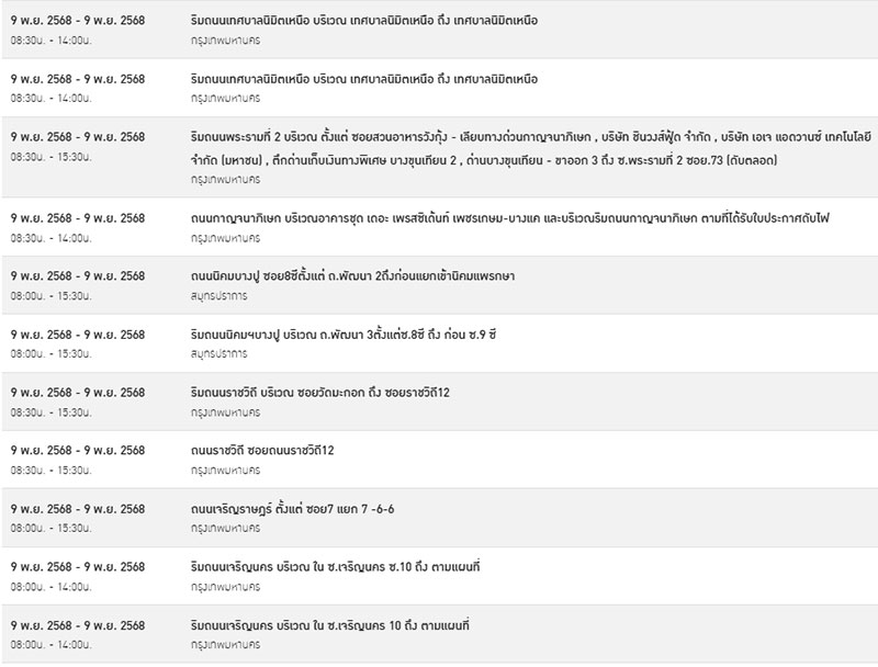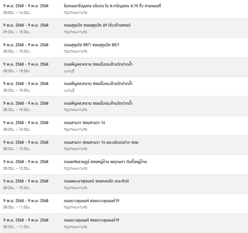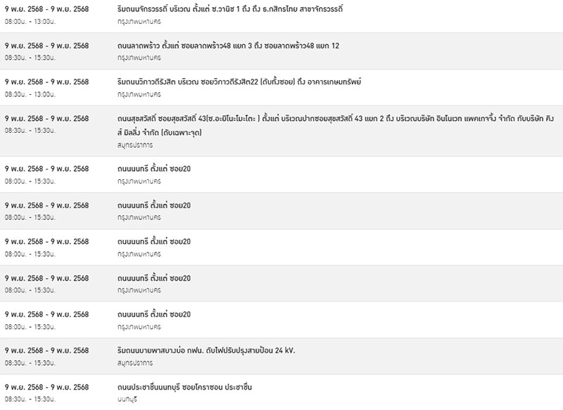 วันที่ 8 พฤศจิกายน 2568 การไฟฟ้านครหลวง (กฟน.) แจ้งประกาศการ “ดับไฟ” ชั่วคราว ในบางพื้นที่ของกรุงเทพมหานคร สมุทรปราการ และนนทบุรี ในวันอาทิตย์ที่ 9 พฤศจิกายน 2568 เพื่อพัฒนาหรือบำรุงรักษาระบบการจ่ายกระแสไฟฟ้าให้มีประสิทธิภาพยิ่งขึ้นใน 49 จุด ดังต่อไปนี้