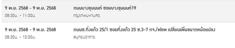 ถนนซ.กิ่งแก้ว 25/1 ซอยกิ่งแก้ว 25 ซ.3-7 กจ./ฟขพ เปลี่ยนเพิ่มขนาดหม้อแปลง เวลา 08.30น. – 13.00น.