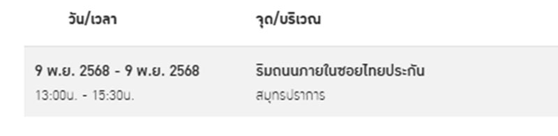 ถนนนิคมบางปู ซอย8ซีตั้งแต่ ถ.พัฒนา 2ถึงก่อนแยกเข้านิคมแพรกษา เวลา 08.00น. – 15.30น.