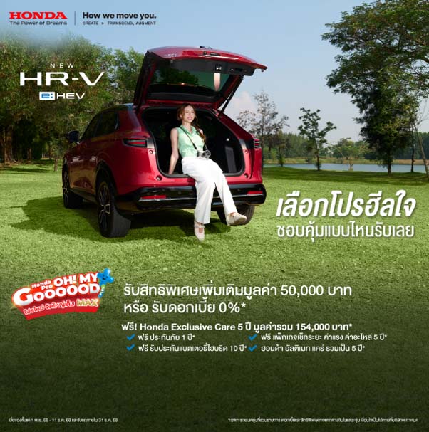 บริษัท ฮอนด้า ออโตโมบิล (ประเทศไทย) จำกัด จัดโปรแรงส่งท้ายปีกับแคมเปญ “Honda Pro OH! MY GOOOOOD PLUS+” เพิ่มเติมทางเลือกใหม่สำหรับรถยนต์สองรุ่นฮิตในไลน์อัป Honda e:HEV – The EXCITING Hybrid ทั้ง Honda Civic e:HEV และ New Honda HR-V e:HEV มอบความคุ้มค่าที่ “ตรงใจ เลือกได้เอง” ให้คุณเลือกได้ดั่งใจรับสิทธิพิเศษเพิ่มเติมมูลค่า 50,000 บาท หรือ เลือกรับดอกเบี้ยพิเศษ 0% พร้อมรับ Honda Exclusive Care 5 ปี มูลค่าสูงสุด 173,000 บาท** ให้การเป็นเจ้าของรถยนต์ทั้งสองรุ่นเป็นเรื่องง่ายกว่าที่เคย สำหรับลูกค้าที่จองรถยนต์ ตั้งแต่วันที่ 1 พฤศจิกายน 2568 – 11 ธันวาคม 2568 และรับรถภายในวันที่ 31 ธันวาคม 2568 อย่าพลาด! โปรแรงแห่งปีที่ทำให้ความฝันของคุณเป็นจริง