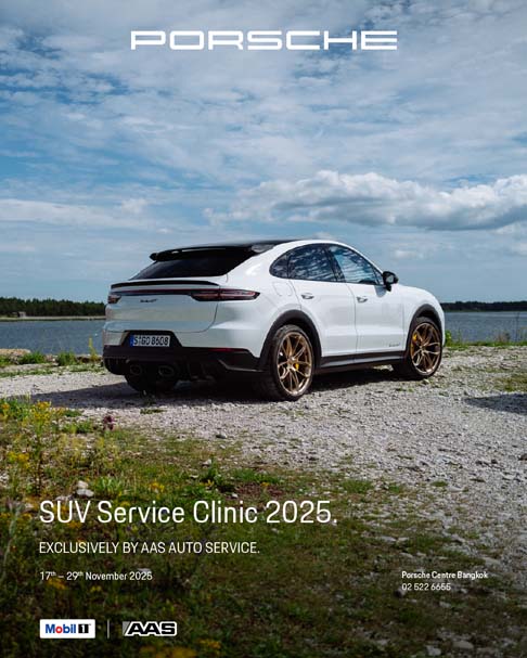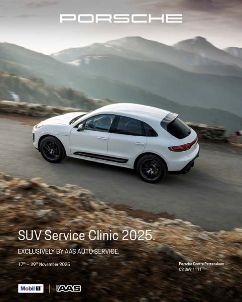 แคมเปญพิเศษ “Porsche SUV Service Clinic 2025” จัดขึ้นระหว่างวันที่ 17 – 29 พฤศจิกายน 2568 ณ Porsche Centre Bangkok และ Porsche Centre Pattanakarn โดยมุ่งเน้นการดูแลรถยนต์ปอร์เช่ในกลุ่ม SUV อย่างละเอียดครบถ้วน ภายใต้แนวคิด ‘AAS Looking After YOU and Your Car’ เพื่อมอบความอุ่นใจและความมั่นใจให้แก่สมาชิกครอบครัวเอเอเอสฯ ทุกท่านในทุกการเดินทาง