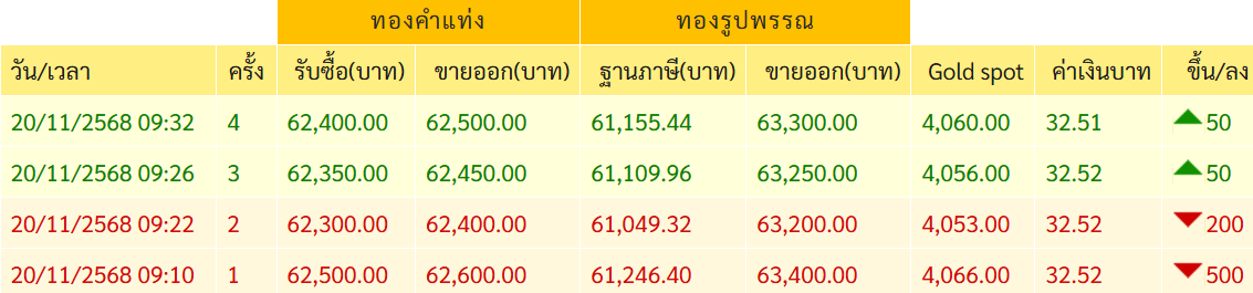 20 พฤศจิกายน 2568 สมาคมค้าทองคำ ประกาศราคา เมื่อเวลา 09.32 น. (ครั้งที่ 4) ปรับลง 400 บาท โดย ทองคำแท่ง รับซื้อ 62,400.00 ขายออก 62,500.00 ทองรูปพรรณ รับซื้อ 61,155.44 ขายออก 63,300.00