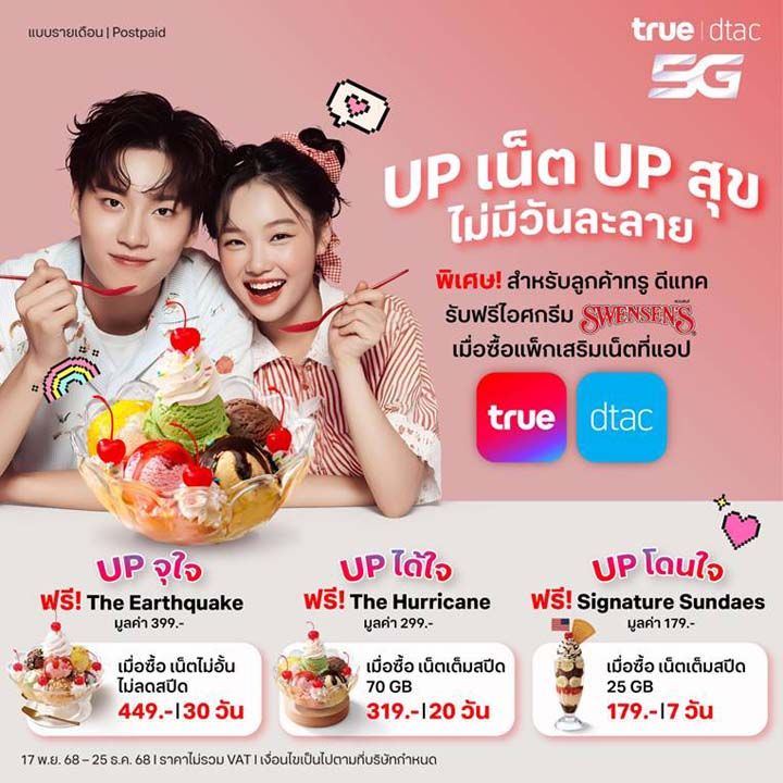 UP เน็ต UP สุข ไม่มีวันละลาย ทรู จับมือสเวนเซ่นส์ เสิร์ฟความสุขส่งท้ายปี ให้ลูกค้าทรู ดีแทค รายเดือน รับฟรี! ไอศกรีมสเวนเซ่นส์ เมื่อซื้อแพ็กเสริมเน็ต เริ่มต้น 179 บาท ผ่าน แอปทรู หรือ แอปดีแทค ตั้งแต่วันนี้ ถึง 25 ธ.ค.68