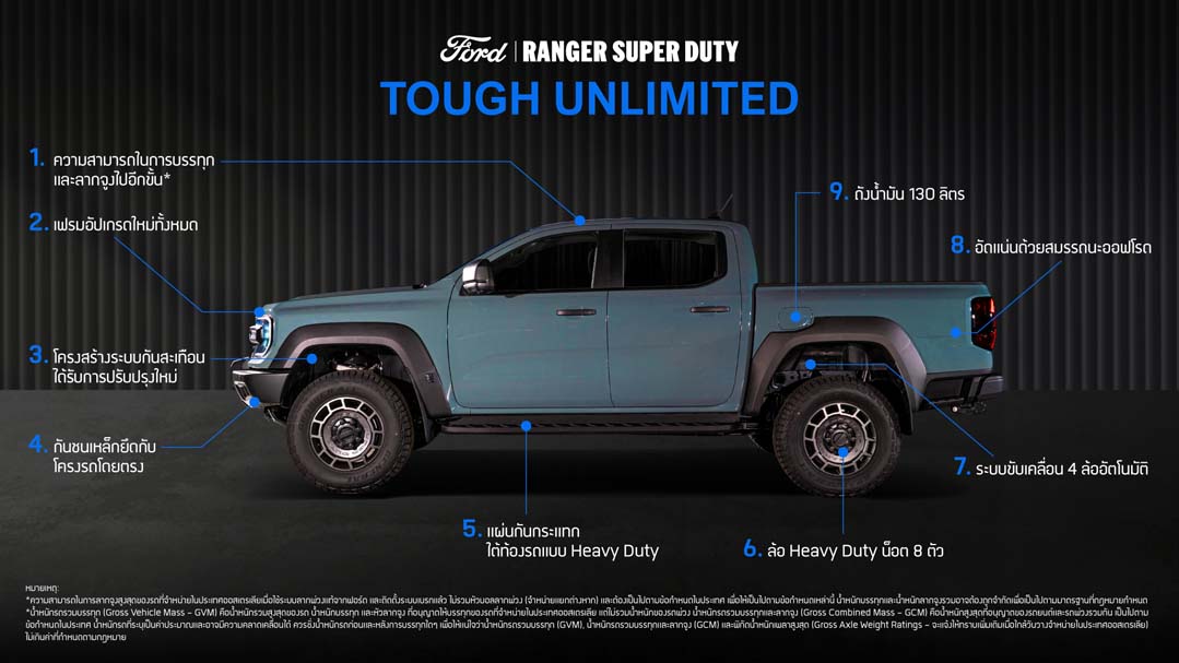 ฟอร์ด เรนเจอร์ ซูเปอร์ ดิวตี้ เป็นรถกระบะที่ผสานความสามารถในการทำงานหนัก (Heavy Duty) เข้ากับความอเนกประสงค์สำหรับการใช้งานในชีวิตประจำวัน มาพร้อมสมรรถนะรองรับการลากจูงสูงสุด 4,500 กิโลกรัม1 น้ำหนักรถสูงสุดรวมบรรทุก (GVM) สูงสุดถึง 4,500 กิโลกรัม2 โดยมีน้ำหนักรถสูงสุดรวมบรรทุกและลากจูง (GCM) ถึง 8,000 กิโลกรัม2 พร้อมการออกแบบช่วงล่างที่พัฒนาให้มีความแข็งแรงขึ้นไปอีกขั้น กำหนดนิยามใหม่ของความแกร่งซึ่งเป็นหัวใจสำคัญของการออกแบบและการพัฒนา