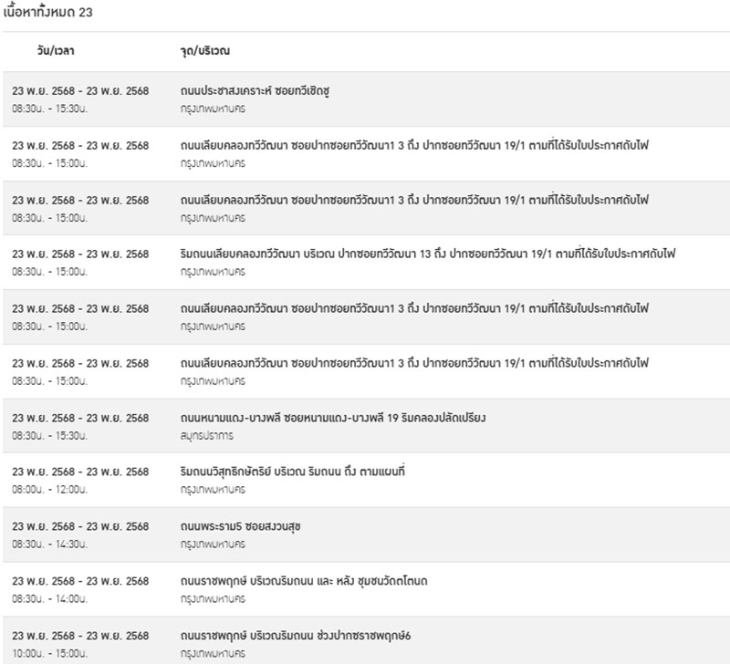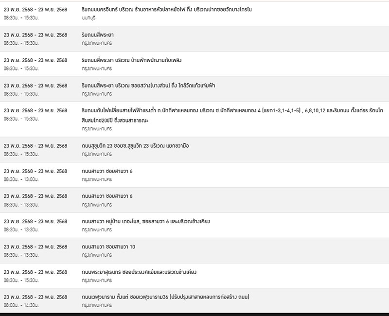 วันที่ 22 พฤศจิกายน 2568 การไฟฟ้านครหลวง (กฟน.) แจ้งประกาศการ “ดับไฟ” ชั่วคราว ในบางพื้นที่ของกรุงเทพมหานคร สมุทรปราการ และนนทบุรี ในวันอาทิตย์ที่ 23 พฤศจิกายน 2568 เพื่อพัฒนาหรือบำรุงรักษาระบบการจ่ายกระแสไฟฟ้าให้มีประสิทธิภาพยิ่งขึ้นใน 23 จุด ดังต่อไปนี้