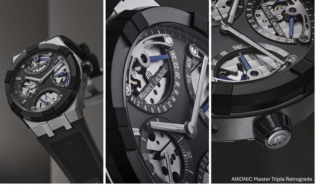 สำหรับคอลเลคชั่นใหม่! ที่น่าจับตาและได้เปิดตัวอย่างเป็นทางการภายในงานนี้คือ รุ่น AIKONIC โดยเป็นการต่อยอดจากความสำเร็จของรุ่นที่เป็น Signature Watches ของแบรนด์อย่าง AIKON ซึ่งมีรากฐานการออกแบบมาจากนาฬิการุ่นดังอย่างCalypso มาก่อนและ AIKON เองก็ได้ทำให้แบรนด์กลายเป็นที่รู้จักของคนไปทั่วโลก โดยนาฬิการุ่นใหม่ AIKON ที่มีตัว IC เพิ่มเข้ามาจะหมายถึง “Innovative Craftsmanship” หรือความประณีตในงานสร้างสรรค์นวัตกรรม โดยนาฬิกา AIKONIC มีรุ่นที่น่าสนใจอย่าง AIKONIC Master Triple Retrograde 43 mm. เป็นนาฬิการุ่นใหม่ที่รวมเอา 'งานฝีมืออันล้ำสมัย' ที่ผสมผสานวัสดุและเทคโนโลยีที่ทันสมัยที่สุดเข้ากับระบบคอมพลิเคชั่นอันเป็นเอกลักษณ์ของแบรนด์หน้าปัดแอนทราไซต์ตกแต่งด้วยการขัดด้านแบบแนวตั้ง โอบล้อมองค์ประกอบแบบสเกเลตันด้วยช่อง 4 ช่อง กลไกอัตโนมัติ ML291 ยังประดับด้วยลวดลาย Côtes de Genève ซึ่งเป็นการตกแต่งแบบคลาสสิกที่ประกอบด้วยเส้นแนวตั้ง ณ ตำแหน่ง 9 นาฬิกาของช่องบนหน้าปัดจะแสดงวินาทีขนาดเล็กอีก 3 ช่องที่เหลือคือตัวบอกเวลาแบบเรโทรเกรด โดยจะแสดงเวลาที่ประเทศบ้านเกิด (GMT) รวมถึงวันและวันที่ นาฬิกา AIKONIC Master Triple Retrograde ผสมผสานลวดลายวงกลมและเส้นแนวตั้ง