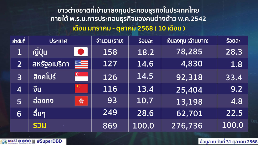 ในประเทศไทย เพิ่มขึ้น 83 ราย (11%) (เดือน ม.ค. - ต.ค. 68 อนุญาต 869 ราย / เดือน ม.ค. - ต.ค. 67 อนุญาต 786 ราย) และมีมูลค่าการลงทุนเพิ่มขึ้น 115,567 ล้านบาท (72%) (เดือน ม.ค. - ต.ค. 68 ลงทุน 276,736 ล้านบาท / เดือน ม.ค. - ต.ค. 67 ลงทุน 161,169 ล้านบาท) รวมถึงมีการจ้างงานคนไทยจากนักลงทุนที่ขอรับใบอนุญาตประกอบธุรกิจของคนต่างด้าวรวม 5,364 คน ซึ่งเพิ่มขึ้นจากปีก่อน 2,331 คน (77%) (เดือน ม.ค. - ต.ค. 68 จ้างงาน 5,364 คน / เดือน ม.ค. - ต.ค. 67 จ้างงาน 3,033 คน) โดยจำนวนนักลงทุนที่เข้ามาสูงสุดยังคงเป็นนักลงทุนญี่ปุ่นเช่นเดียวกับปีก่อน