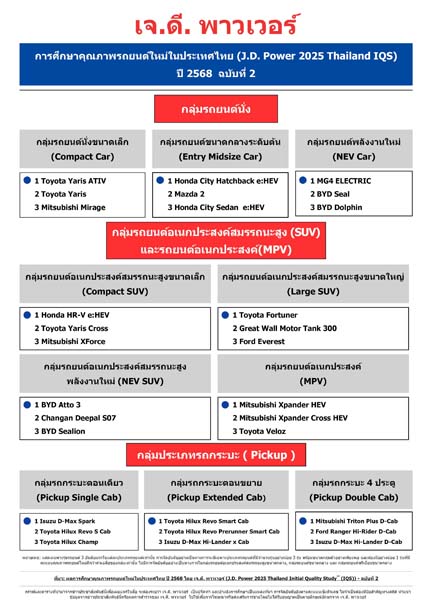 เจ.ดี.พาวเวอร์ เผยผลการศึกษาคุณภาพรถยนต์ใหม่ในประเทศไทย ประจำปี 2568 (J.D. Power 2025 Thailand Initial Quality StudySM (IQS)) ในกลุ่มเจ้าของรถใหม่จำนวน 4,832 ราย ซึ่งซื้อรถระหว่างเดือนมกราคมถึงกันยายน 2568 โดยทำการสำรวจภาคสนามระหว่างเดือนมิถุนายนถึงตุลาคม 2568 ใน 22 เมืองใหญ่ทั่วประเทศไทย ครอบคลุมรถยนต์ 57 รุ่นจาก 15 แบรนด์ โดยจัดอันดับจากจำนวนปัญหาต่อรถยนต์ 100 คัน (PP100) ซึ่งคะแนนปัญหาน้อยแสดงถึงคุณภาพที่ดีกว่า