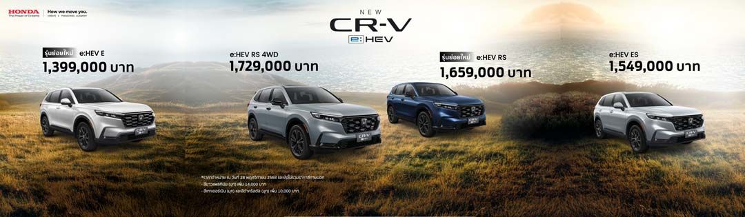 Honda CR-V e:HEV ใหม่ ที่มาพร้อมการปรับไลน์อัปเป็นฟูลไฮบริด e:HEV ในทุกรุ่นย่อย ให้ลูกค้าได้สัมผัสกับ SUV ไฮบริดสำหรับครอบครัวที่ครบและคุ้มค่าในราคาที่เข้าถึงง่ายยิ่งขึ้น เริ่มต้นเพียง 1,399,000 บาท พร้อมเพิ่มรุ่นย่อยใหม่ e:HEV HuNT กับดีไซน์อัปลุคสะท้อนไวบ์ที่แตกต่าง และ e:HEV RS ที่มาพร้อมระบบขับเคลื่อน 2 ล้อ เพื่อตอบโจทย์ทุกความต้องการลูกค้าอย่างลงตัว มีให้เลือกรวมทั้งหมด 5 รุ่นย่อย โดยราคาจำหน่ายอย่างเป็นทางการ ได้แก่