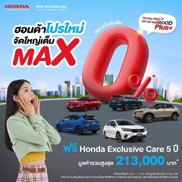 โดยทุกรุ่นมาพร้อมขบวนความคุ้มค่าแบบพลัสพลัส จัดใหญ่ส่งท้ายปี กับแคมเปญพิเศษ “Honda Pro OH! MY GOOOOOD PLUS+” โปรใหม่ จัดใหญ่เต็ม MAX จัดเต็มข้อเสนอที่หลากหลาย** สำหรับรถยนต์ฮอนด้าทุกรุ่น อาทิ ดอกเบี้ยพิเศษเริ่มต้นที่ 0% พร้อม Honda Exclusive Care 5 ปี หรือ Double Smile Plus ผ่อนเบา ดาวน์สบาย รวมถึงรับสิทธิพิเศษเพิ่มเติมเฉพาะรุ่นที่ร่วมรายการ** มูลค่า 50,000 – 85,000 บาท เมื่อจองตั้งแต่วันที่