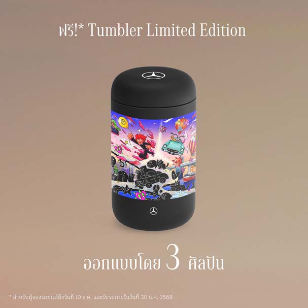 และสำหรับลูกค้าที่จองรถยนต์เมอร์เซเดส-เบนซ์ ในงาน*** จะได้รับกล้อง Mercedes-Benz Drive Recorder 360° มูลค่า 16,500 บาท* และของสมนาคุณสุดพิเศษ Tumbler Limited Edition ที่ออกแบบโดยศิลปินรุ่นใหม่ทั้ง 3 ท่าน ได้แก่ “Jeff Aphisit” “Bomfha” และ “MR.HALFMAN”