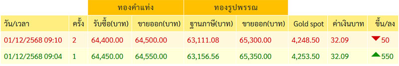 สมาคมค้าทองคำ รายงานว่า ราคาทองวันนี้ 1 ธันวาคม 2568 เวลา 09:04 น. ราคาทองครั้งที่ 1 เพิ่มขึ้น 550 บาท