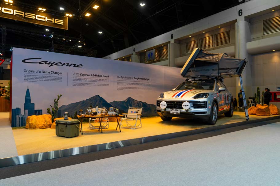 พร้อมการจัดแสดงรถยนต์ไฮไลท์อย่าง คาเยนน์ เอส อี ไฮบริด คูเป้ (Cayenne S E-Hybrid Coupé) รุ่นประกอบที่มาเลเซีย ที่เข้าร่วมภารกิจ Epic Road Trip การเดินทางจากกรุงเทพฯ สู่สตุ๊ทการ์ท ในเวลา 61 วัน ผ่าน 17 ประเทศ รวมระยะทางกว่า 22,000 กิโลเมตร และคาเยนน์ เอส อี ไฮบริด คูเป้ รุ่นปรับโฉมปี 2026 ที่ประกอบในประเทศมาเลเซีย ที่แสดงให้เห็นถึงความทนทานและมาตรฐานทางวิศวกรรมที่แข็งแกร่งของคาเยนน์ รุ่นประกอบในภูมิภาค