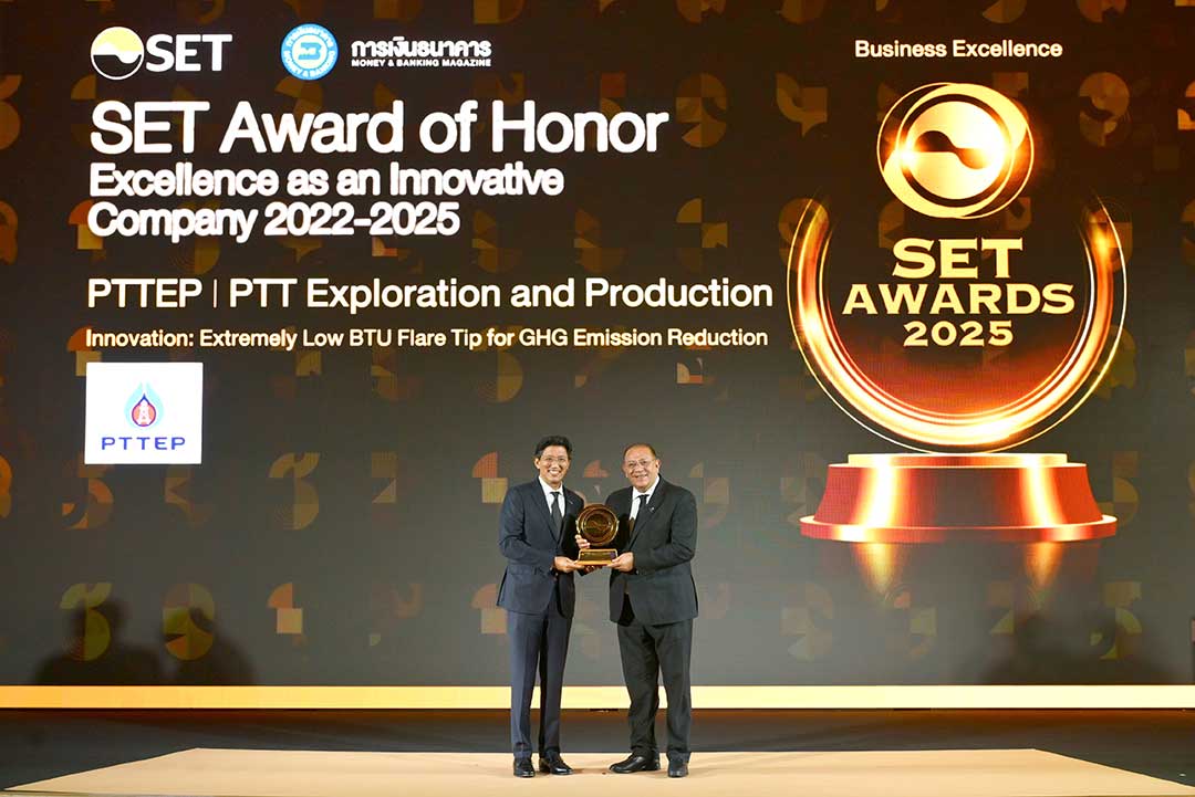 นายมนตรี ลาวัลย์ชัยกุล ประธานเจ้าหน้าที่บริหาร บริษัท ปตท.สำรวจและผลิตปิโตรเลียม จำกัด (มหาชน) หรือ ปตท.สผ. เข้ารับ 2 รางวัลอันทรงเกียรติจากงาน SET Awards 2025 ได้แก่ รางวัลเกียรติยศแห่งความสำเร็จด้านนวัตกรรม (SET Award of Honor : Best Innovative Company) ต่อเนื่องเป็นปีที่ 4 จากผลงานนวัตกรรม “หัวเผาก๊าซทิ้งเพื่อลดการปล่อยก๊าซเรือนกระจก (Extremely Low BTU Flare Tip for Greenhouse Gas Emission Reduction)” ซึ่งเป็นหนึ่งในนวัตกรรมที่ช่วยเพิ่มประสิทธิภาพการเผาไหม้ก๊าซฯ และลดการปล่อยก๊าซเรือนกระจก และรางวัลยอดเยี่ยมด้านนักลงทุนสัมพันธ์ (Best Investor Relations Awards) ในกลุ่มบริษัทจดทะเบียนที่มีมูลค่าตลาดสูงกว่า 1 แสนล้านบาท