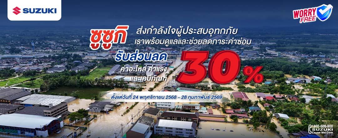 บริษัท ซูซูกิ มอเตอร์ (ประเทศไทย) จำกัด มีนโยบายเร่งด่วน ภายใต้โครงการ “ซูซูกิร่วมใจ ห่วงใยผู้ประสบภัยน้ำท่วม” โดยร่วมมือกับผู้จำหน่ายรถยนต์ซูซูกิ ในพื้นที่ประสบภัย 9 จังหวัดภาคใต้ มอบส่วนลดพิเศษสูงสุด 30% ในการนำรถเข้าซ่อมแซม และฟื้นฟูสภาพรถยนต์ที่ศูนย์บริการมาตรฐานซูซูกิ เพื่อเป็นการช่วยแบ่งเบาภาระ และบรรเทาความเดือดร้อนให้กับผู้ใช้รถยนต์ซูซูกิทุกท่านให้สามารถกลับมาใช้ชีวิตประจำวันได้อย่างรวดเร็ว