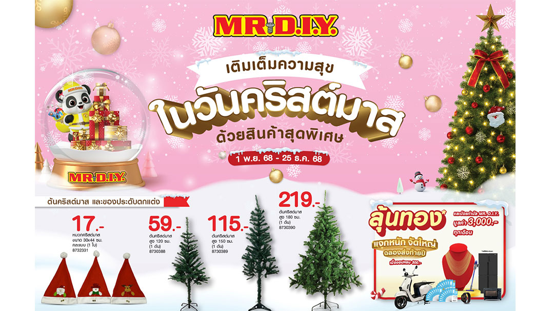 จัดโปรโมชัน “เติมเต็มความสุขในวันคริสต์มาส” ชวนช้อปต้อนรับเทศกาลสุดอบอุ่นส่งท้ายปี ด้วยสินค้าคริสต์มาสหลากหลายดีไซน์ รวม 210 รายการ ในราคาถูกคุ้มเสมอ (Always Low Prices) ที่ร้านมิสเตอร์. ดี.ไอ.วาย. สาขาที่ร่วมรายการ ตั้งแต่วันนี้ถึง 25 ธันวาคม 2568 ในราคาเริ่มต้น 17 บาท อาทิ หมวกคริสต์มาส ราคา 17 บาท ต้นคริสต์มาส สูง 120 ซม. ราคา 59 บาท ต้นคริสต์มาส สูง 150 ซม. ราคา 115 บาท ต้นคริสต์มาส สูง 180 ซม. ราคา 219 บาท และสินค้าอื่นๆอีกมากมาย นอกจากนี้ยังสามารถร่วมกิจกรรม “แจกหนัก จัดใหญ่ ส่งท้ายปี” ลุ้นรับทอง บัตรของขวัญ MR. D.I.Y. มูลค่า 3,000 บาท และของรางวัลอื่นๆรวม 324 รางวัล มูลค่ารวมกว่า 1.2 ล้านบาท เมื่อช้อปครบ 300 บาทต่อใบเสร็จ ที่ร้านมิสเตอร์. ดี.ไอ.วาย. ทุกสาขา และช่องทางออนไลน์ตลอด 24 ชั่วโมงที่ WWW.MRDIY.CO.TH ตั้งแต่วันนี้ถึง 31 ธันวาคม 2568