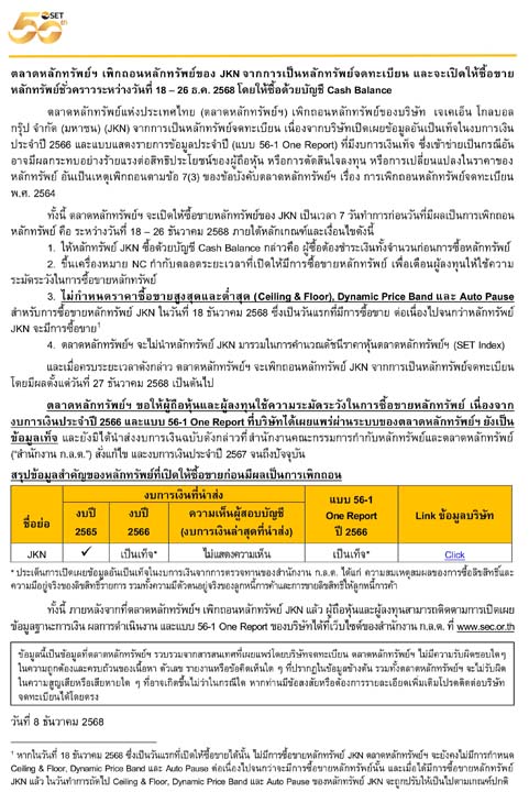และเมื่อครบระยะเวลาดังกล่าว ตลาดหลักทรัพย์ฯ จะเพิกถอนหลักทรัพย์ JKN จากการเป็นหลักทรัพย์จดทะเบียน โดยมีผลตั้งแต่วันที่ 27 ธันวาคม 2568 เป็นต้นไป