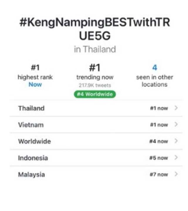 สร้างปรากฏการณ์สยามแตก! แฟนคลับแห่รับ ‘เก่ง-น้ำปิง’ เข้าครอบครัวทรู การันตีสัญญาณแรง ส่งมอบความสุขทะลุพิกัดสยาม สะเทือนโซเชียล ดันแฮชแท็ก #KengNampingBESTwithTRUE5G จนพุ่งชนเพดาน อันดับ 1 เทรนด์ x ไทยและเวียดนาม แบบม้วนเดียวจบ แถมยังแรงไกลไปถึง อันดับ 4 ของโลก พร้อมยึดพื้นที่เทรนด์ในอินโดนีเซียและมาเลเซีย ด้วยยอด repost ใน X ถล่มทลายกว่า 2.06 ล้านข้อความและ Engagement มากกว่า 4 ล้าน (ข้อมูล ณ วันที่ 7 ธ.ค. 2568) การันตีความปังของคู่จิ้นขวัญใจมหาชน และสัญญาณทรูที่เชื่อมความรักของแฟนๆ ถึงศิลปินได้เร็ว แรง และชัดเจนที่สุดในวินาทีนี้!