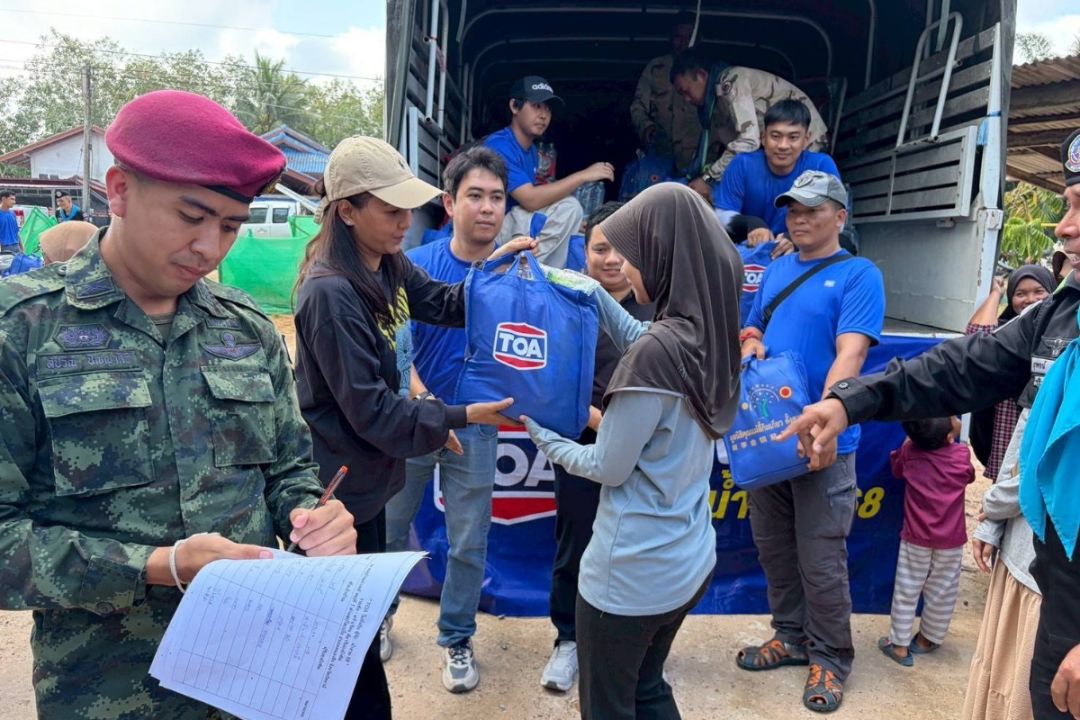 นายประจักษ์ ตั้งคารวคุณ ประธานผู้ก่อตั้ง TOA เผยว่า จากความเสียหายอย่างหนักที่เกิดจากอุทกภัยครั้งใหญ่ในภาคใต้ ซึ่งส่งผลกระทบต่อชีวิตความเป็นอยู่ของพี่น้องประชาชน และระบบสาธารณสุขโดยตรง เราจึงมีความห่วงใยและเข้าใจถึงความยากลำบากที่ทุกคนกำลังเผชิญ จึงพร้อมเป็นส่วนหนึ่งในการสนับสนุน ช่วยเหลือ เยียวยา และฟื้นฟูผู้ประสบอุทกภัยอย่างต่อเนื่องหลังสถานการณ์น้ำท่วมคลี่คลายลง เดินหน้า โครงการ TOA ไม่ทิ้งกัน "รวมพลังไทย ฟื้นฟูน้ำท่วมภาคใต้" ตั้งแต่การลงพื้นที่ช่วยเหลือเยียวยาพี่น้องประชาชนชาวใต้ ในการระดมทีม ‘ทีโอเอ อาสา’ ร่วมกับกำลังทหาร (กอ.รมน.ภาค 4 ส่วนหน้า, กองทัพภาคที่ 4, มณฑลทหารบกที่ 42) ส่งมอบถุงยังชีพกว่า 2,000 ชุด ประกอบด้วย ข้าวสาร บะหมี่กึ่งสำเร็จรูป ปลากระป๋อง ถั่วมารูโจ้ น้ำยาทำความสะอาดทีโพล์ และสเปรย์กำจัดแมลงเชนไดร้ท์ รวมทั้งสิ่งของบรรเทาทุกข์ ผ้าห่มกันหนาว เสื้อยืด น้ำดื่ม และชุดผลิตภัณฑ์ทำความสะอาดทีโพล์ แจกจ่ายให้แก่ประชาชนในพื้นที่ชุมชนต่างๆ ที่ได้รับผลกระทบอย่างทั่วถึง อาทิ ชุมชนบ้านกลางนา ชุมชนอู่ ทส. ชุมชนจันทร์วิโรจน์ ชุมชนบางแฟ้บ ชุมชนบ้านพักรถไฟ ชุมชนศิครินทร์ และชุมชนรายย่อยอื่นๆ รวมทั้งในพื้นที่จังหวัดยะลา และปัตตานี เพื่อเร่งเยียวยา ให้ความช่วยเหลือเข้าถึงทุกคนอย่างทั่วถึงและรวดเร็วที่สุด
