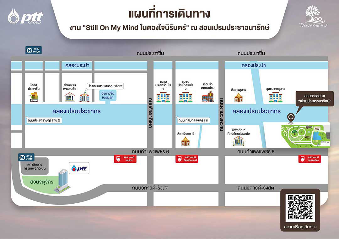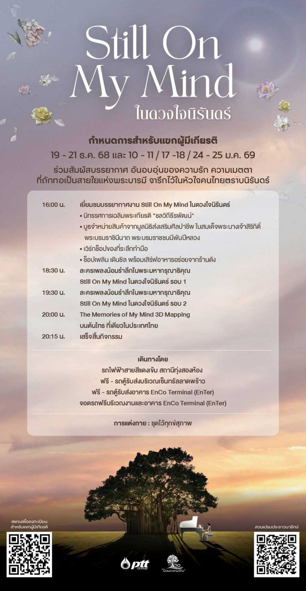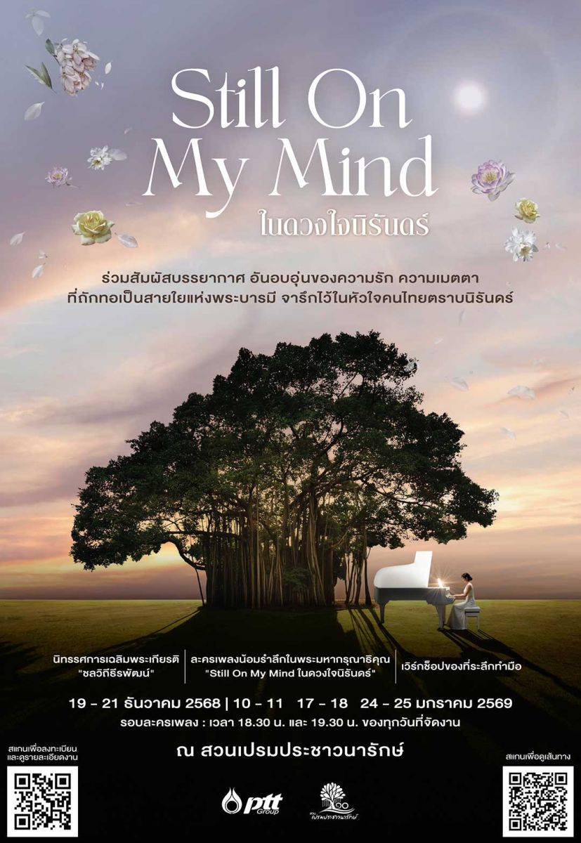 เพื่อน้อมรำลึกในพระมหากรุณาธิคุณอันหาที่สุดมิได้ ของสมเด็จพระนางเจ้าสิริกิติ์ พระบรมราชินีนาถ พระบรมราชชนนีพันปีหลวง กลุ่ม ปตท. ขอเชิญประชาชนชาวไทย ร่วมรักษา สืบสาน ต่อยอดพระราชปณิธานในการดูแลรักษาทรัพยากรธรรมชาติ สิ่งแวดล้อม สร้างความแข็งแรงทางเศรษฐกิจและความสุขที่ยั่งยืนในการดำเนินชีวิต โดยมีพระองค์ท่านเป็นแรงบันดาลใจ ในงาน “Still On My Mind ในดวงใจนิรันดร์” สัมผัสบรรยากาศ อันอบอุ่นของความรัก ความเมตตา ที่ถักทอเป็นสายใยแห่งพระบารมี จารึกไว้ในหัวใจคนไทย ตราบนิรันดร์ ผ่านการแสดงละครเพลงน้อมรำลึกในพระมหากรุณาธิคุณ นิทรรศการและกิจกรรมเวิร์กช็อปสร้างสรรค์ สื่อถึงพระเมตตาที่ทรงปฏิบัติพระราชกรณียกิจเพื่อประชาชนเสมอมาและสายใยแห่งความรัก ความผูกพันระหว่างพระองค์ท่านกับพสกนิกรไทย ในวันที่ 19 – 21 ธันวาคม 2568 และต่อเนื่องในช่วงต้นปีใหม่ ระหว่างวันที่ 10–11, 17–18 และ 24–25 มกราคม 2569 เปิดให้ประชาชนเข้าชมอย่างทั่วถึง โดยไม่เสียค่าใช้จ่าย ตั้งแต่เวลา 16.00–21.00 น. ณ สวนเปรมประชาวนารักษ์ พร้อมบรรยากาศสวนยามเย็นที่จะเปลี่ยนสู่ค่ำคืนแสนอบอุ่นและตราตรึงใจ