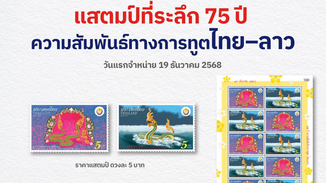 บริษัท ไปรษณีย์ไทย จำกัด เปิดจำหน่าย แสตมป์ที่ระลึก “75 ปี ความสัมพันธ์ทางการทูตไทย–ลาว” เพื่อเฉลิมฉลองวาระครบรอบความสัมพันธ์ทางการทูตระหว่างราชอาณาจักรไทยและสาธารณรัฐประชาธิปไตยประชาชนลาว ผ่านการออกแบบโดยไปรษณีย์ไทย และไปรษณีย์ลาว ได้แก่ 1.พญาศรีสัตตนาคราช 2.พญานาคในตระกูลวิรูปักษ์สีทอง สะท้อนความร่วมมือด้านการออกแบบและการแลกเปลี่ยนทางวัฒนธรรมของทั้งสองประเทศอย่างชัดเจน โดยแสตมป์ชุดนี้จำหน่ายในราคาดวงละ 5 บาท 1 แผ่นมี 10 ดวง ซองวันแรกจำหน่ายราคา 23 บาท สามารถซื้อได้ที่พิพิธภัณฑ์แสตมป์ไทย อาคารปฏิบัติการไปรษณีย์สามเสนใน (BTS สะพานควาย) ไปรษณีย์ในกรุงเทพฯ ไปรษณีย์จังหวัด หรือซื้อทางออนไลน์ที่เว็บไซต์ และแอปพลิเคชัน ThailandPostMart ตั้งแต่วันที่ 19 ธันวาคม 2568 เป็นต้นไป
