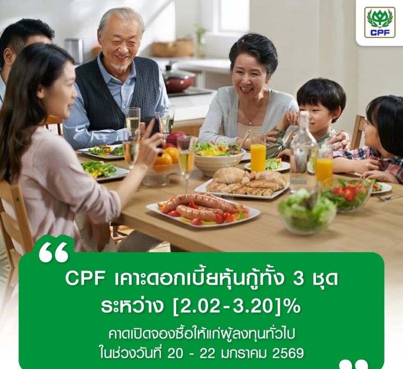 บริษัท เจริญโภคภัณฑ์อาหาร จำกัด (มหาชน) (“CPF”) ผู้ดำเนินธุรกิจเกษตรอุตสาหกรรมและอาหารแบบครบวงจร ใน 17 ประเทศทั่วโลก ภายใต้วิสัยทัศน์ “ครัวของโลก” ประกาศดอกเบี้ยหุ้นกู้ทั้ง 3 ชุด อัตราดอกเบี้ยคงที่ระหว่าง [2.02-3.20]% มาพร้อมอันดับความน่าเชื่อถือระดับ “A” แนวโน้ม “คงที่” เตรียมเสนอขายหุ้นกู้ให้แก่ผู้ลงทุนทั่วไป และผู้ลงทุนสถาบัน จัดจำหน่ายผ่านสถาบันการเงินชั้นนำ 11 แห่ง ได้แก่ ธนาคารกรุงเทพ ธนาคารกรุงไทย ธนาคารกสิกรไทย ธนาคารไทยพาณิชย์ ธนาคารทหารไทยธนชาต ธนาคารยูโอบี ธนาคารซีไอเอ็มบี ไทย บริษัทหลักทรัพย์ เกียรตินาคินภัทร บริษัทหลักทรัพย์ เอเซีย พลัส บริษัทหลักทรัพย์ กรุงไทย เอ็กซ์สปริง และบริษัทหลักทรัพย์ หยวนต้า (ประเทศไทย) ผ่านทางสาขาและช่องทางออนไลน์ รวมถึงการขายผ่านแอปพลิเคชัน TrueMoney Wallet โดยหุ้นกู้ทั้ง 3 ชุด มีรายละเอียดดังนี้