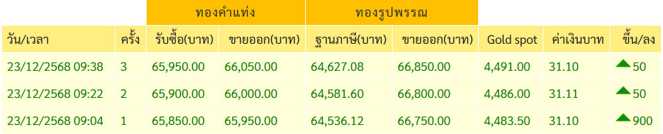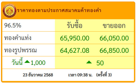 ส่งผลให้ "ราคาทองคำแท่ง" รับซื้อบาทละ 65,950.00 บาท ขายออกบาทละ 65,050.00 บาท ส่วน "ราคาทองรูปพรรณ" รับซื้อบาทละ 64,627.08 บาท ขายออกบาทละ 66,850.00 บาท