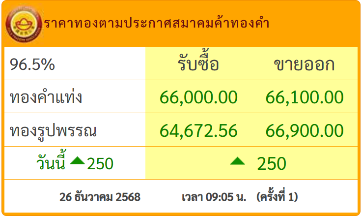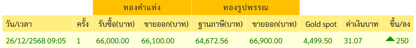 ราคาทองคำประจำวันที่ 26 ธ.ค.68 ปรับเพิ่มขึ้น 250 บาท โดยราคาทองรูปพรรณขยับมาอยู่ที่บาทละ 66,900.00 บาท ตามข้อมูลล่าสุดจากเว็บไซต์ของ สมาคมค้าทองคำ เมื่อเวลา 09.05 น. ที่ผ่านมา