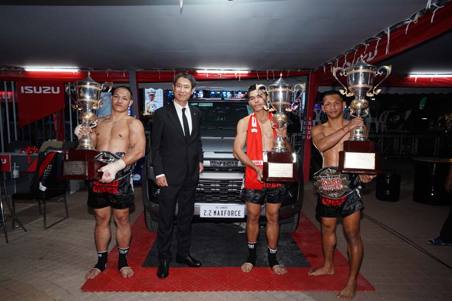 มร. ทาคาชิ ฮาตะ กรรมการผู้จัดการ บริษัท ตรีเพชรอีซูซุเซลส์ จำกัด กล่าวว่า “ขอแสดงความยินดีกับ จรวดศึก และ เขี้ยวเพชร ที่คว้าแชมป์ THAI FIGHT 2025 มาครองได้อย่างสง่างาม ด้วยหัวใจนักสู้ที่แข็งแกร่ง จนได้รับพระราชทานถ้วยรางวัลอันทรงเกียรติ ซึ่งถือเป็นความสำเร็จอันน่าภาคภูมิใจในอาชีพนักชก ผมขออวยพรให้ทั้งสองท่านประสบความสำเร็จยิ่งขึ้นไปในอนาคต พร้อมกันนี้ ขอขอบคุณผู้ชมทุกท่าน ที่ให้การสนับสนุนรถอีซูซุ รายการ Isuzu Thailand Championship และ THAI FIGHT ด้วยดีเสมอมา ทุกแรงใจของท่านคือ พลังสำคัญที่ขับเคลื่อนให้อีซูซุ มุ่งมั่นพัฒนาอย่างไม่หยุดยั้ง และเราหวังเป็นอย่างยิ่งว่า จะได้รับความไว้วางใจจากทุกท่านเช่นนี้ตลอดไป”