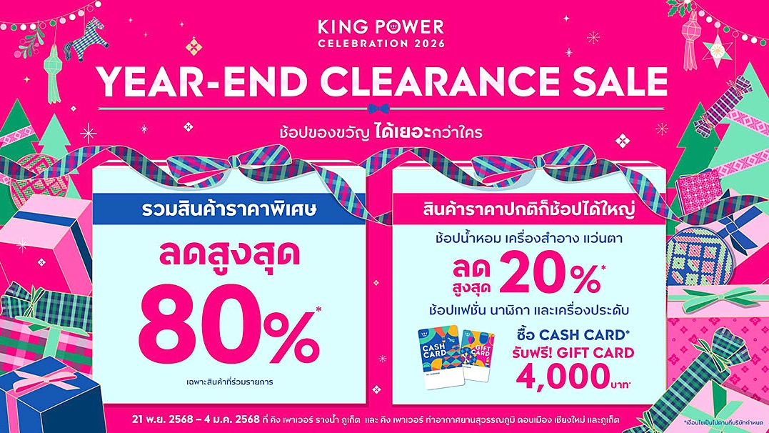 จัดแคมเปญ “YEAR-END CLEARANCE SALE” พบกับสินค้าสุดเอ็กซ์คลูซิฟจากแบรนด์ดัง ลดกระหน่ำสูงสุดถึง 80% เอาใจทุกไลฟ์สไตล์ ทั้งแฟชั่น น้ำหอม เครื่องสำอาง และอีกมากมายที่ร่วมรายการ ตั้งแต่วันนี้ถึง 4 มกราคม 2569 สมัครสมาชิก POWER PASS ฟรี! ที่ คิง เพาเวอร์ ทุกสาขา พร้อมรับสิทธิพิเศษเฉพาะสมาชิกได้ทันที อาทิ รับเงินในบัญชีสมาชิก มูลค่า 100 บาท, รับคูปองส่วนลด 30% จำนวน 3 ใบ สำหรับช้อปสินค้า 1 ชิ้น ที่แผนกน้ำหอม เครื่องสำอาง และสิทธิประโยชน์อื่นๆอีกมากมาย