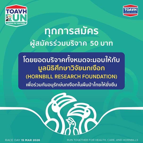 ขอเชิญชวนประชาชน นักวิ่ง และผู้รักธรรมชาติทุกท่าน ร่วมเป็นส่วนหนึ่งในการอนุรักษ์นกเงือก และฟื้นฟูฝืนป่าไทย ด้วยการสมัครเข้าร่วมกิจกรรมวิ่งการกุศล “TOAVH RUN X Homes for Hornbills” ในวันอาทิตย์ที่ 15 มีนาคม 2569 ณ สวนหลวง ร.9 – บึงหนองบอน ผ่านช่องทางออนไลน์ https://race.thai.run/toavhrun2026 เปิดรับสมัครแล้วตั้งแต่วันนี้เป็นต้นไป