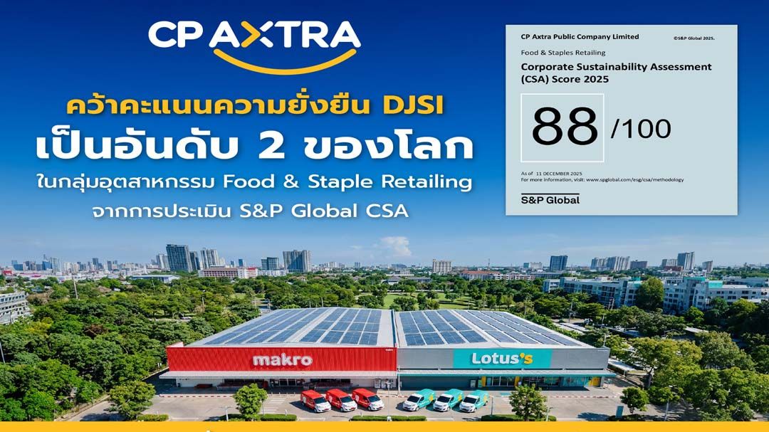 บริษัท ซีพี แอ็กซ์ตร้า จำกัด (มหาชน) หรือ CP AXTRA ผู้ดำเนินธุรกิจค้าส่งค้าปลีก “แม็คโคร–โลตัส” สร้างผลงานโดดเด่นด้านความยั่งยืนระดับโลก จากการประเมิน Corporate Sustainability Assessment (CSA) โดย S&P Global องค์กรผู้จัดทำดัชนี Dow Jones Sustainability Indices (DJSI) ด้วยคะแนนรวม 88 จาก 100 คะแนน ในปี 2025 ซึ่งเพิ่มขึ้นอย่างต่อเนื่องจากปี 2023 และ 2024 ส่งผลให้บริษัทขยับขึ้นสู่อันดับ 2 ของโลกในกลุ่มอุตสาหกรรม Food & Staples Retailing