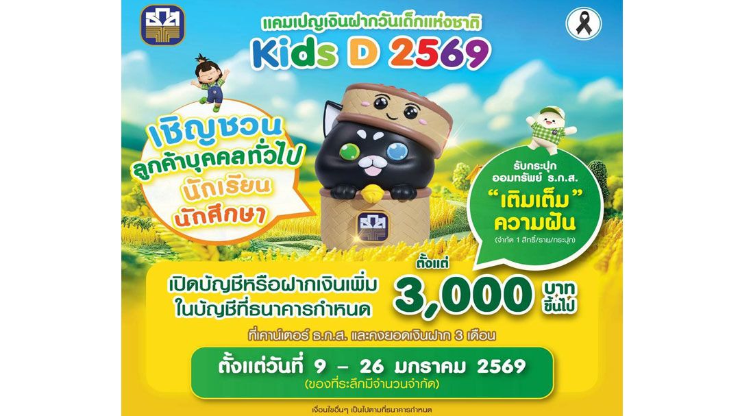 ธนาคารเพื่อการเกษตรและสหกรณ์การเกษตร (ธ.ก.ส.) เปิดตัวกระปุกออมทรัพย์ ธ.ก.ส. “เติมเต็ม ความฝัน” น้องแมวสุดน่ารัก เนื่องในโอกาสวันเด็กแห่งขาติ 2569 เพื่อสร้างเสริมนิสัยการออมเงินในเด็กและเยาวชน นักเรียน นักศึกษา ตลอดจนบุคคลทั่วไป ผ่านการฝากเงินในแคมเปญเงินฝากวันเด็กแห่งชาติ “Kids D 2569” เพียงเปิดบัญชีใหม่ หรือฝากเงินเพิ่มเข้าบัญชีเงินฝาก อาทิ เงินฝากออมทรัพย์ เงินฝากออมทรัพย์ทวีโชค เงินฝากออมทรัพย์พื้นฐาน เงินฝากออมทรัพย์ Senior Savings เงินฝากออมทรัพย์พิเศษ เงินฝากแก้วมรกต และเงินฝากรักษาทรัพย์ ผ่านเคาน์เตอร์ที่สาขาของธนาคารทั่วประเทศ จำนวน 3,000 บาทขึ้นไป และคงยอดเงินฝากไว้ 3 เดือนนับจากวันที่ฝาก ได้ตั้งแต่วันที่ 9-26 มกราคม 2569 รับเลยกระปุกออมทรัพย์ ธ.ก.ส.“เติมเต็ม ความฝัน” จำกัดลูกค้า 1 รายต่อกระปุก 1 ชิ้น ฝากก่อนได้ก่อนของมีจำนวนจำกัด ! สอบถามรายละเอียดเพิ่มเติมได้ที่ ธ.ก.ส. ทุกสาขา หรือ Call Center 02 555 0555