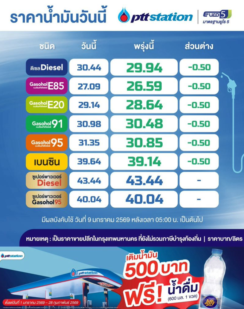 บริษัท ปตท.น้ำมันและการค้าปลีก จำกัด (มหาชน) (OR) ประกาศ ปรับลดราคาน้ำมันทุกชนิด โดยปรับลดราคาน้ำมัน เกรดมาตรฐานทุกชนิด 50 สตางค์/ลิตร มีผลวันที่ 9 ม.ค. 69 ตั้งแต่เวลา 05:00 เป็นต้นไป *ราคาที่ประกาศเป็นราคาขายปลีกในกรุงเทพมหานคร ที่ยังไม่รวมภาษีบำรุงท้องถิ่น