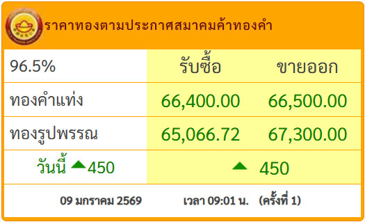 ส่งผลให้ "ราคาทองคำแท่ง" รับซื้อบาทละ 66,400 บาท ขายออกบาทละ 66,500 บาท ส่วน "ราคาทองรูปพรรณ" รับซื้อบาทละ 65,066.72 บาท ขายออกบาทละ 67,300 บาท